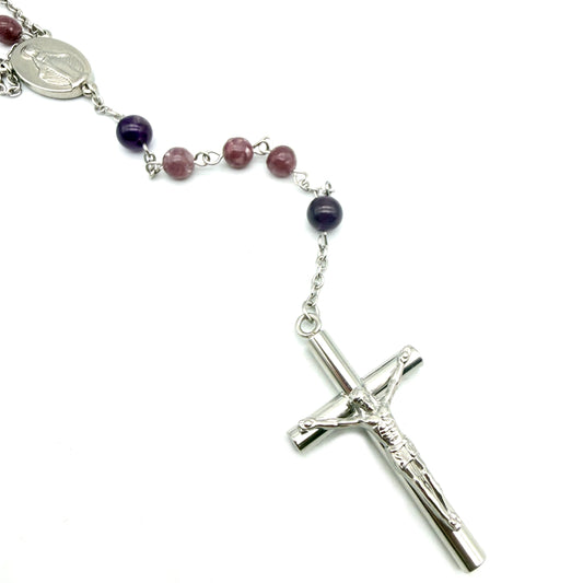 VICTIME DE SON SUCCÈSChapelet artisanal en Lépidolite et Améthyste – Acier inoxydable